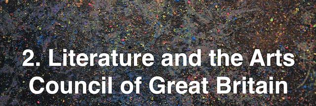 Keywords: John Maynard Keynes, Arnold Goodman, A Policy for the Arts, Eric W. White, Cecil Day-Lewis, B. S. Johnson, Dambudzo Marechera, James Currey the Caribbean Artists Movement, Kamau Brathwaite, Wilson Harris, John Calder