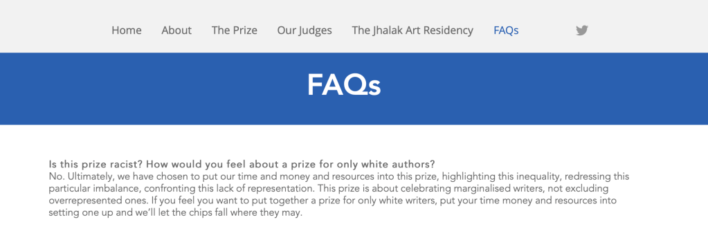 This was not the first time a literary prize had come under fire for attempting to deal with the effects of what Claire Squires has called publishing’s ‘diversity deficit‘. Back in the late 1980s the Arts Council of Great Britain successfully fought a landmark legal case defending its right to target writers of African, Asian or Caribbean heritage for an annual bursary competition. Targeting specific groups, the Arts Council argued, was an important way of addressing the ‘special needs’ of writers unequally represented in the literary world. Their line of argument relied on an untested exemption clause of the 1976 Race Relations Act designed to cater for those occasions in which certain kinds of discriminations actually advanced the cause of equality.