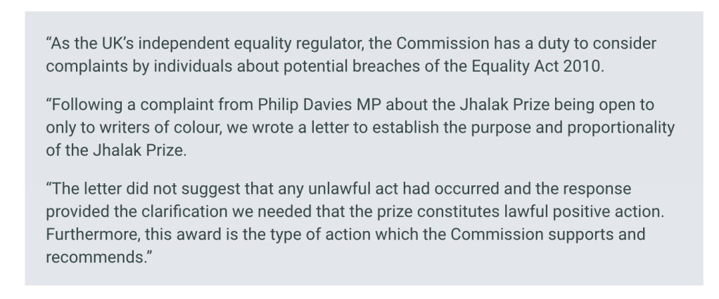 The Equalities and Human Rights Commission responded by making the unusual move — or so it seemed — of issuing a caution to the organisers of the Jhalak Prize for circulating potentially discriminatory promotional materials. The action followed a complaint by the Conservative MP Philip Davis alleging that the prize discriminated against white writers.